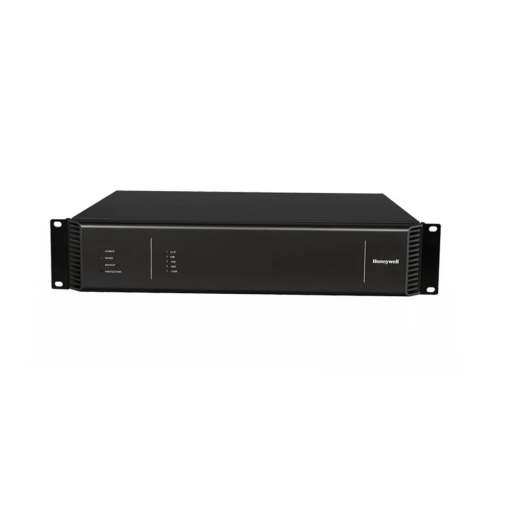 RK-AMP500INTEVIO 500 W Klasse-D VerstärkerDer Klasse-D Verstärker dient zur Verstärkung des Audiosignals zur Ansteuerung von Lautsprechern. Er verfügt über einen sehr hohen Wirkungsgrad und über ein geringes Gewicht. Der Verstärker kann an der Steuereinheit, den Zonenerweiterungen oder als Ersatzverstärker betrieben werden.Eigenschaften:• Hocheffizienter Klasse-D-Verstärker• Ausgangsleistung von bis zu 500 W• Hohe Flexibilität: mit 100 V/70 V Ausgang und Audioeingang• Hohe Zuverlässigkeit: automatische Fehlererkennung, Überlastschutz und geregelter Lüfter• Automatische Ausgangsspannungsbegrenzung• Unterstützt sowohl symmetrische als auch unsymmetrische AudioeingängeTechnische Daten:Netzversorgung:100 V - 240 V 50/60 Hz ACBackup-Versorgung:21,5 V DC ~ 28,5 V DCEingangsleistung: < 700 WSicherung: T10A 250 VAusgangsspannung: 70 V / 100 VMax. Leistung bei 20? Last 500W (beiIntervall-Sprachdurchsagen undHintergrundmusik)RMS Nennleistung bei 25? Last 400W (bei kontinuierlicher Sprachdurchsage, Hintergrundmusikund allen Testsignalen EN54/SPL/STI)Frequenzgang: 80 Hz ~ 18 KHz (+1dB~ -3 dB)Eingangsimpedanz: 20 KOPA-Eingang (RJ-45): 1,4 VLine In: 1,4 VBooster-Eingang: 100 VVerbindungsausgang: 1,4 VSNR: 100 dB ±5 %, A-bewertetTHD: < 0,1 % (bei 1/3 Nennleistung, 1 kHz)Anzeigen: Stromversorgung, Notstromversorgung, Sammelstörung, Schutz und VU-Meter.Kühlung: geregelter LüfterUMGEBUNGSBEDINGUNGEN:Relative Luftfeuchtigkeit: < 95 %, ohne BetauungBetriebstemperatur: -10 °C ~ +55 °C Lagertemperatur: -40 °C ~ +70 °CABMESSUNGEN UND GEWICHT:Abmessungen: (B*H*T) (482 × 88 × 407) mmPackmaß: (B*H*T) (580 × 235 × 552) mmNettogewicht: 11,2 KgBruttogewicht: 13,8 KgHONEYWELLINTEVIO 500 W Klasse-D-EndverstärkerRK-AMP500