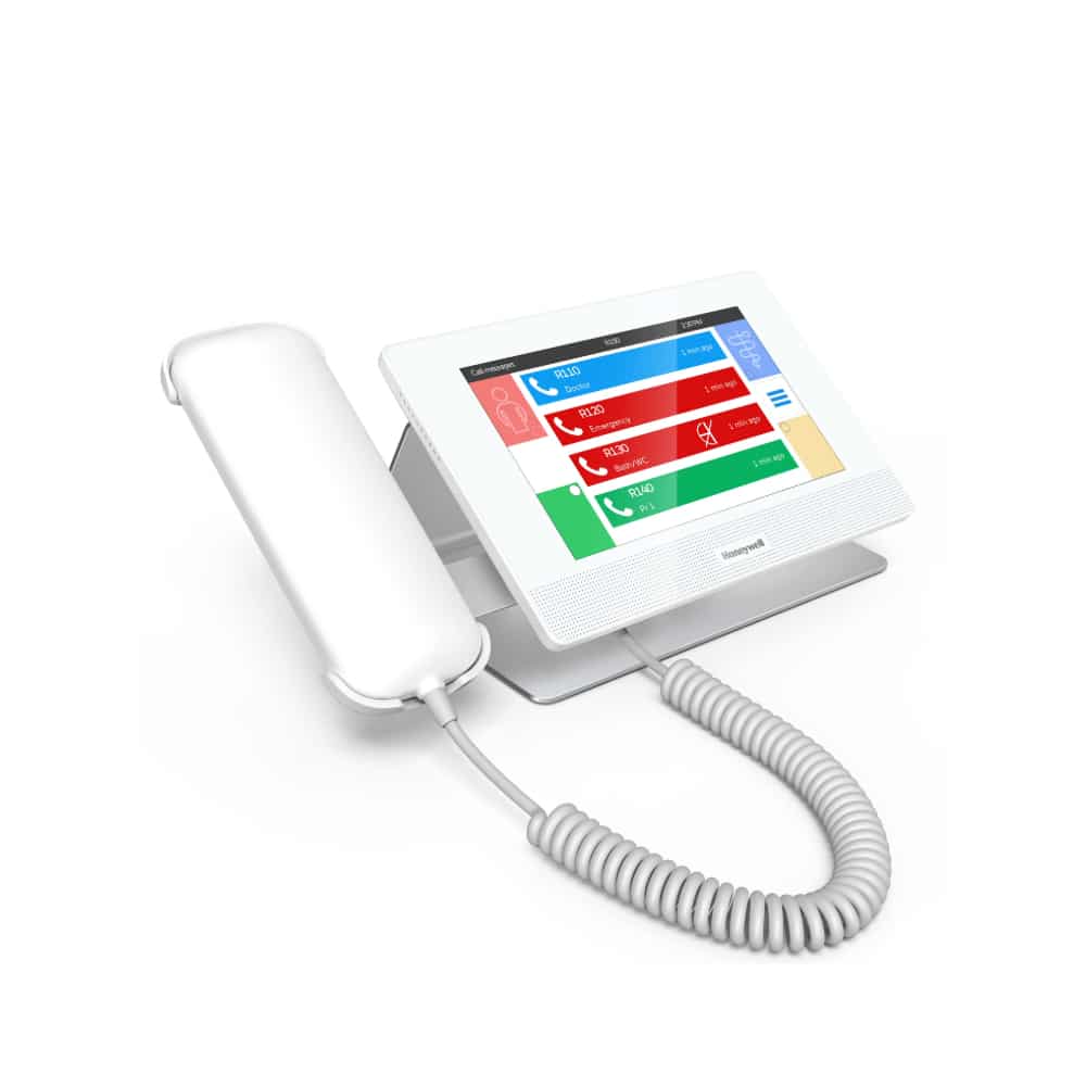 Stationäre IP-Kommunikationszentrale, ausgeführt als Tischgerät mit 7" Touch-Display für Dienstplätze in Pflegeeinrichtungen, inkl. Handapparat für diskrete Sprachkommunikation und Full-Duplex Freisprechfunktion inkl. optimierter Echo-Kompensation.