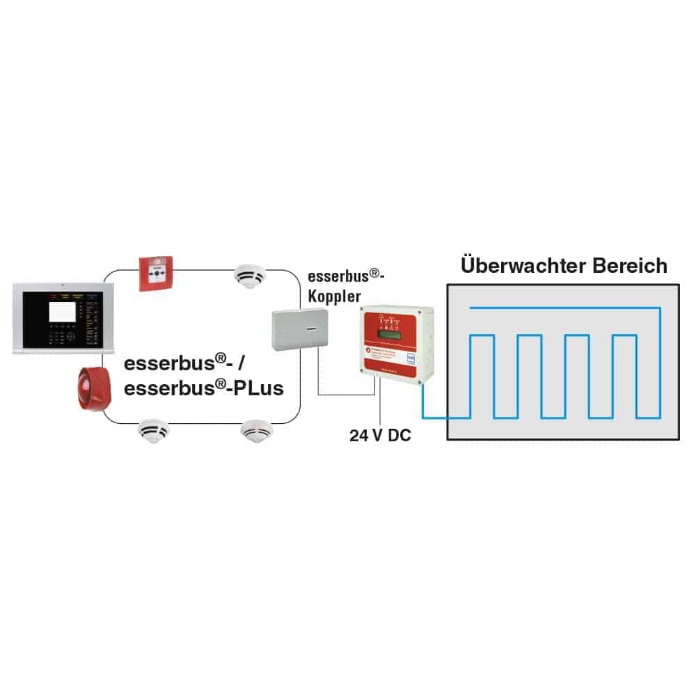 Die Anschaltung an die BMZ erfolgt über den esserbus®-Alarmierungskoppler (Artikelnummer 808623). Die Überwachung der Sensorleitung erfolgt durch das Abschlußmodul (Artikelnummer 762292).
